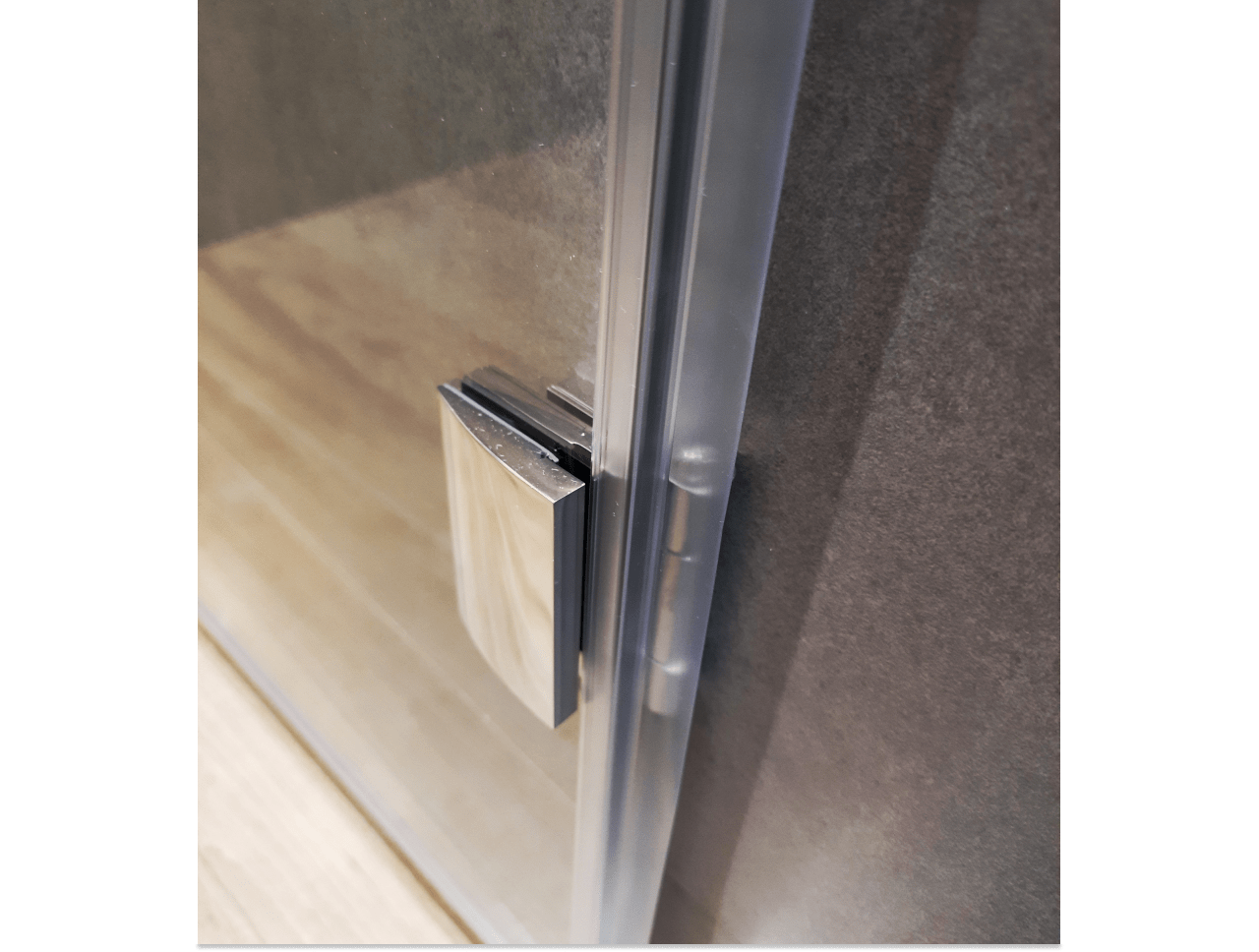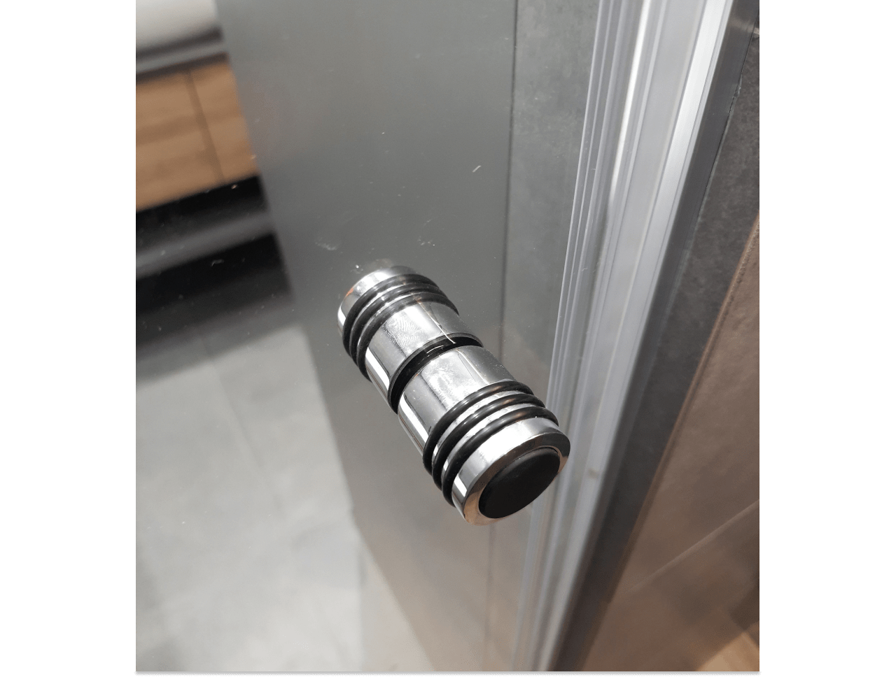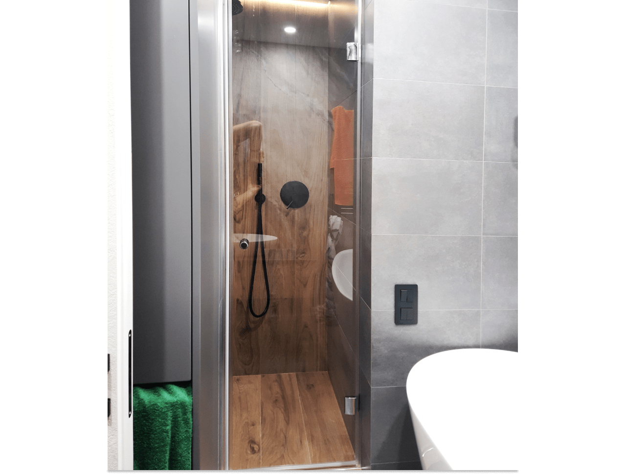 Главная » Каталог » Изготовление и монтаж душевых кабин » Двери » Распашные » Распашная дверь в ванную с черным профилем