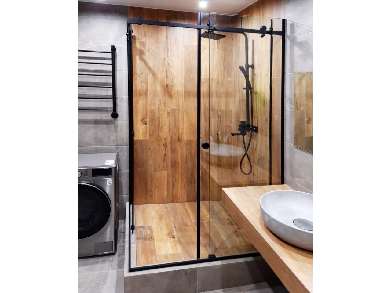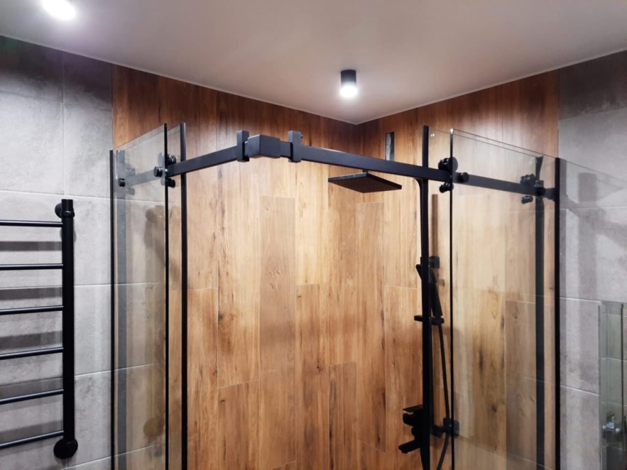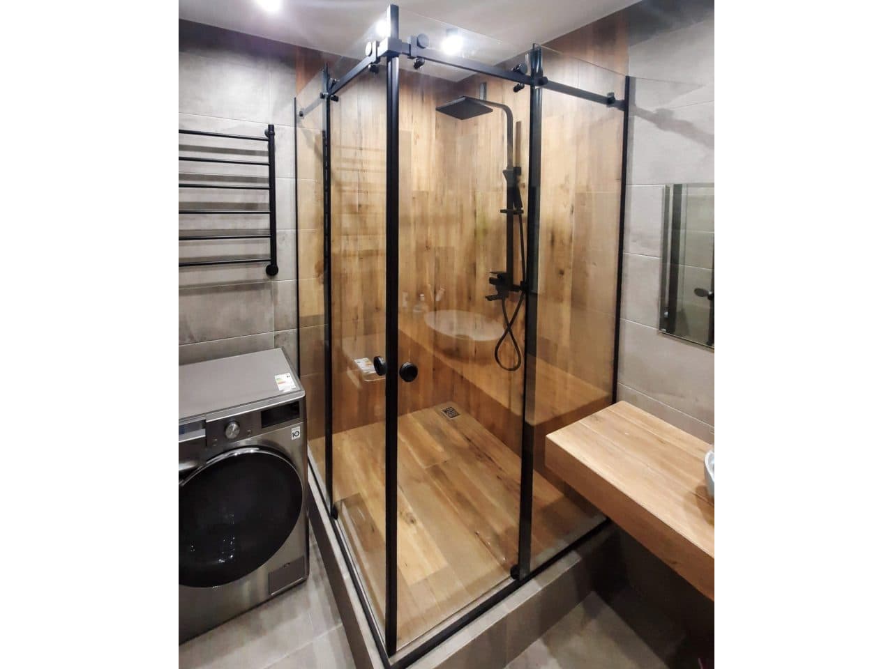 Главная » Каталог » Изготовление и монтаж душевых кабин » Перегородки » Раздвижные » Угловая стеклянная перегородка с раздвижным типом двери