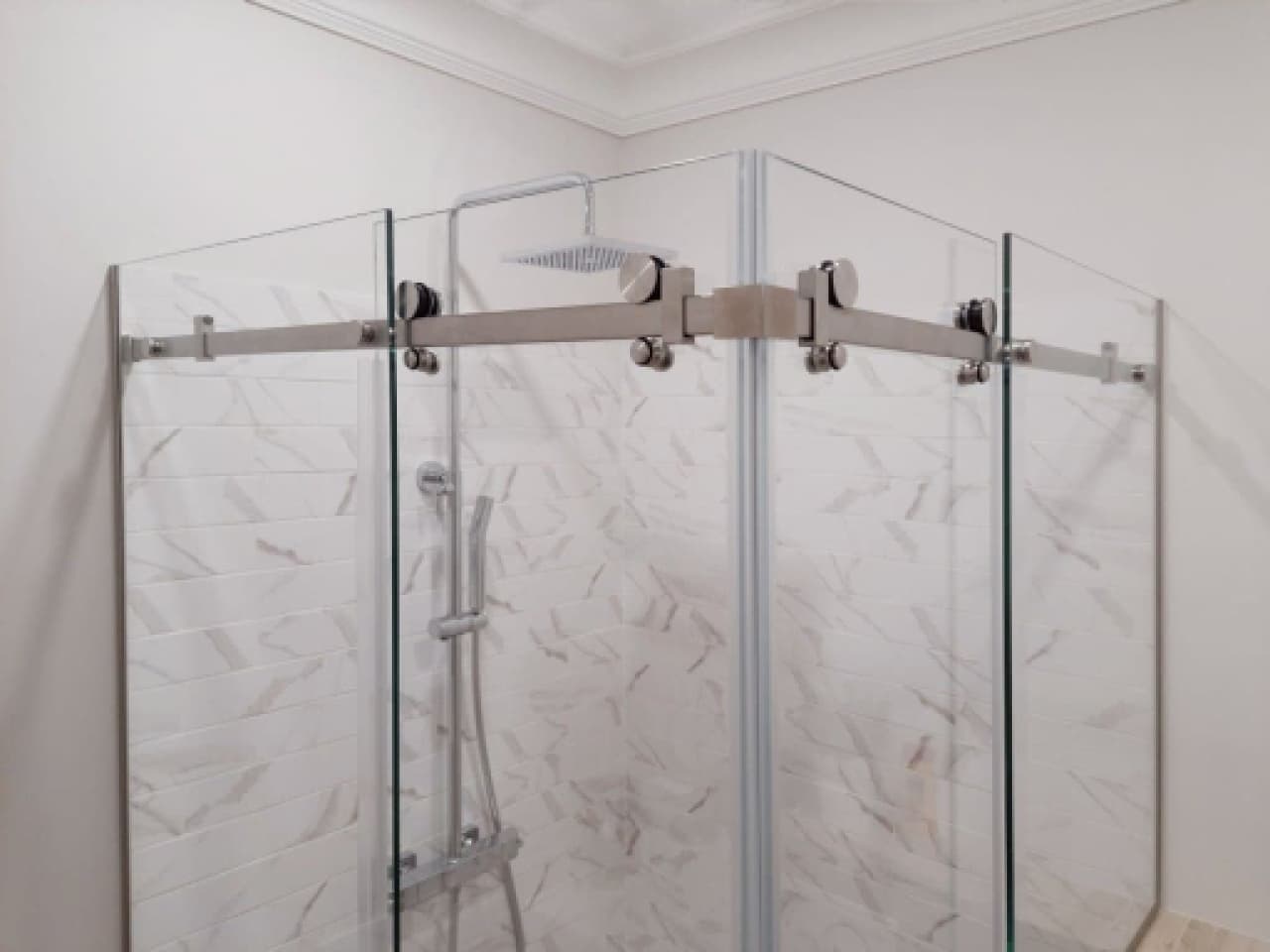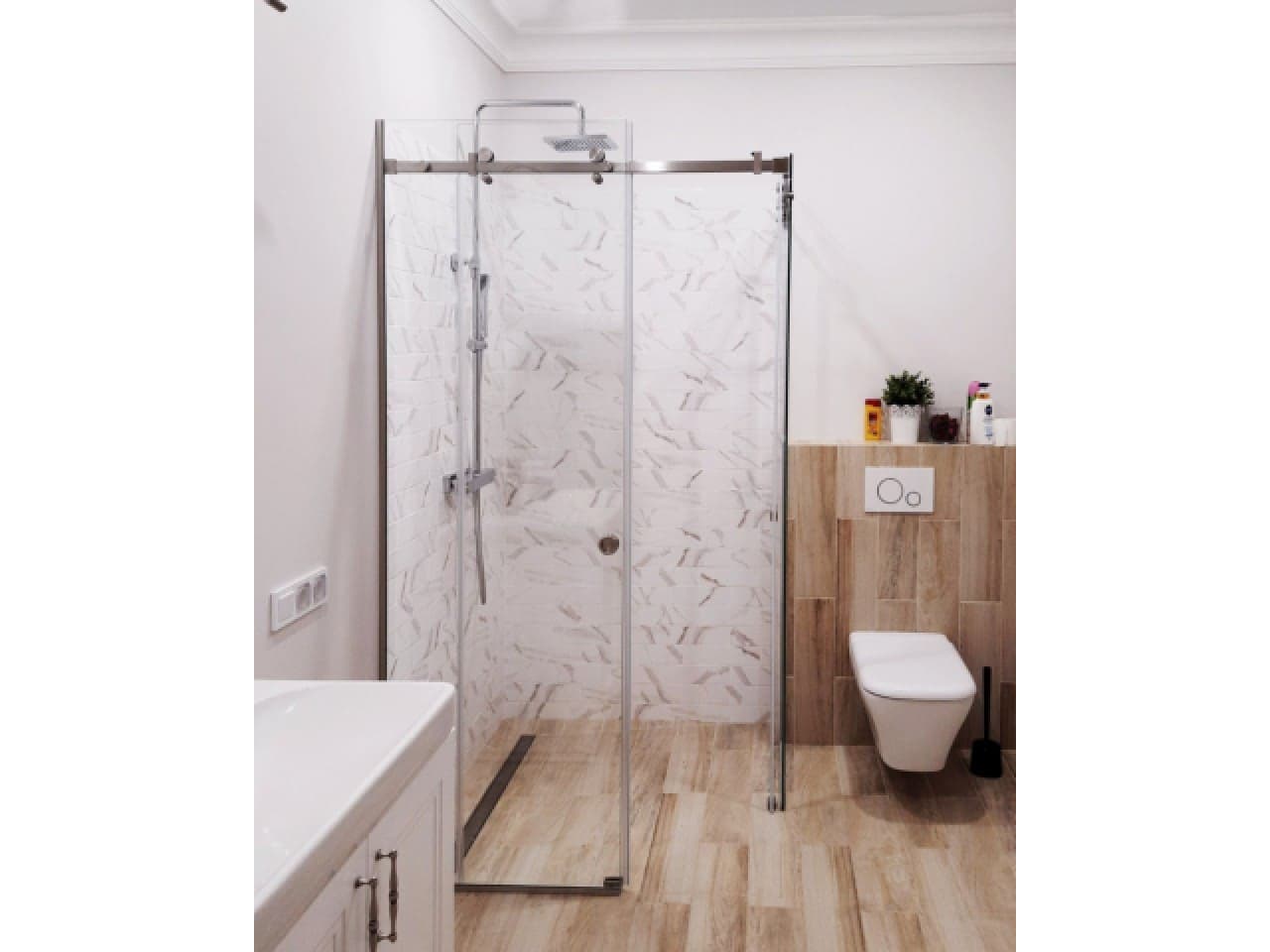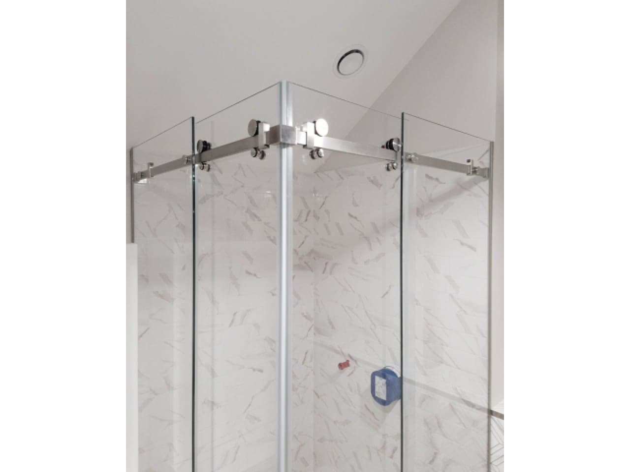 Главная » Каталог » Изготовление и монтаж душевых кабин » Уголки » Стеклянные » Угловая перегородка для душа из осветленного стекла